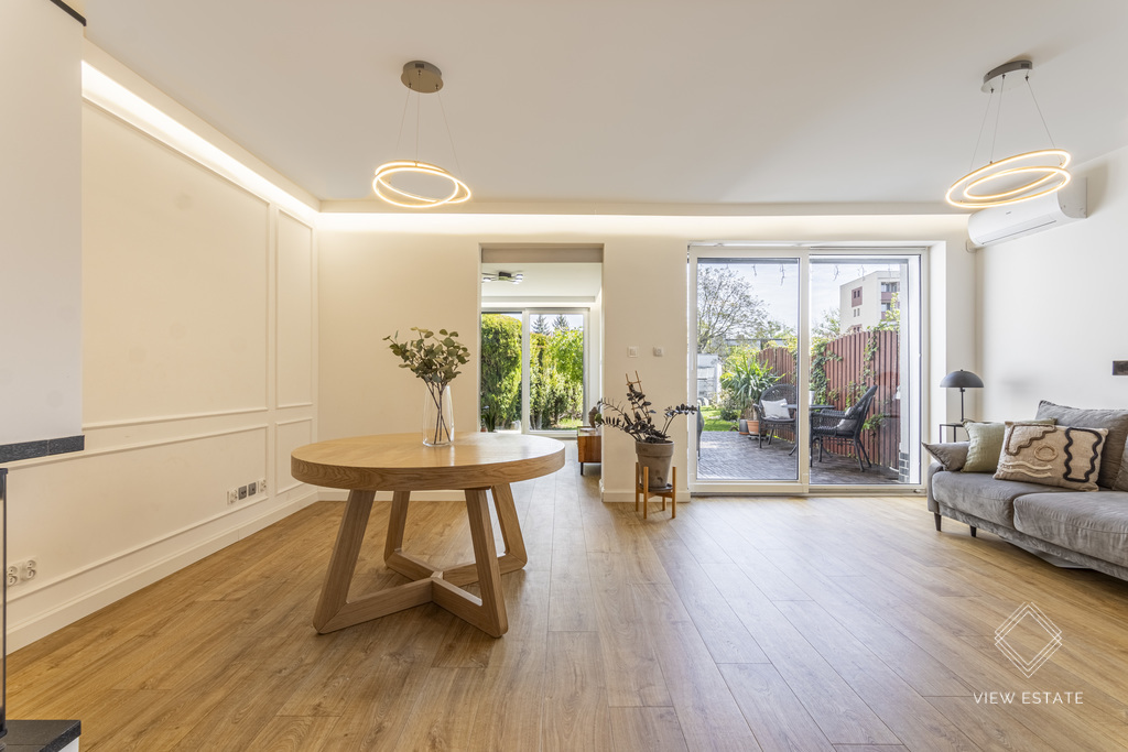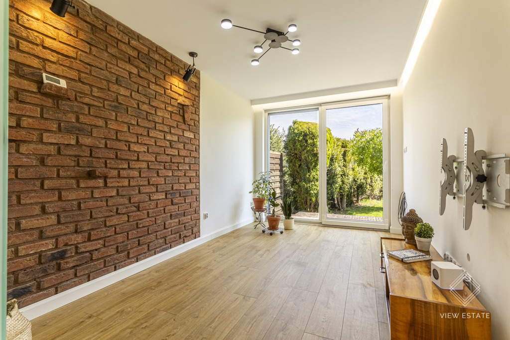 Z parteru jest wyjście na kameralny taras i ogród z pięknie utrzymanym trawnikiem, drzewkami i krzewami oraz oświetleniem i nawodnieniem. Ogród liczy 297 m2.