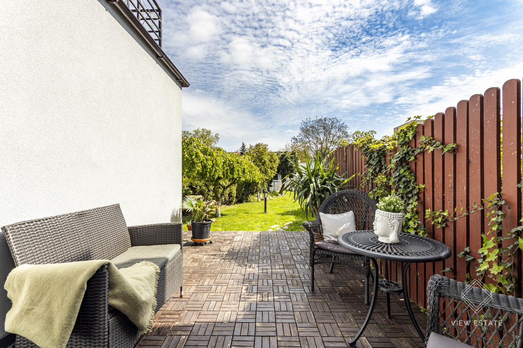 From the ground floor, there is an exit to a cozy terrace and a garden with beautifully maintained lawn, trees, and shrubs, plus lighting and irrigation. The garden is about 300 m2.