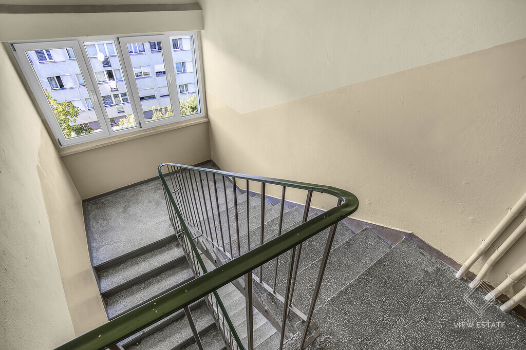 The apartment is located on the 4th floor of a 1970s block (no elevator). A bright and well-maintained stairwell leads to the unit.
