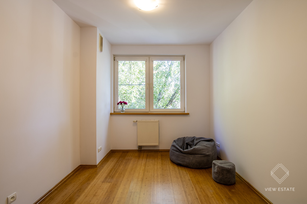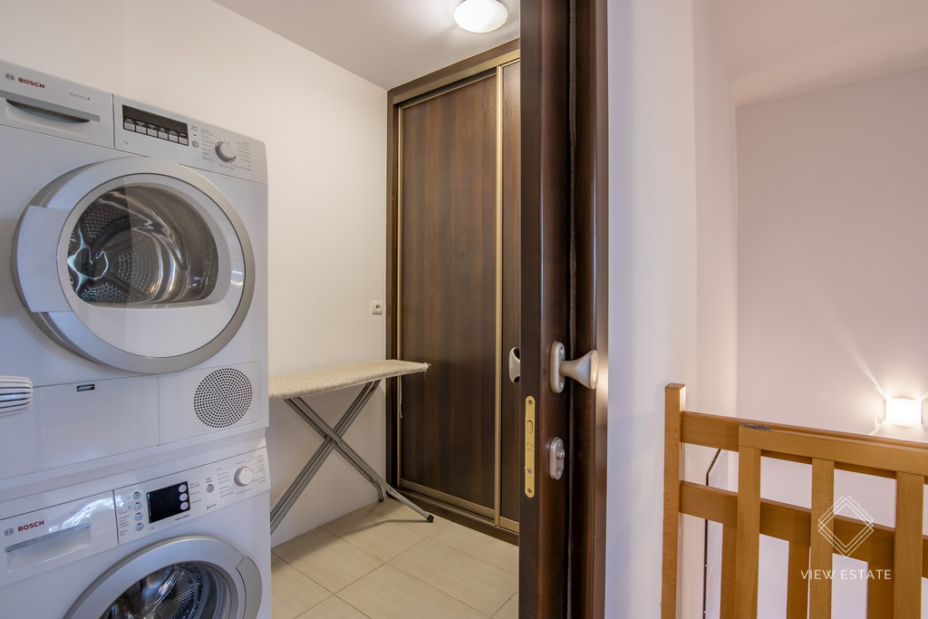 On the second level, there are 2 spacious rooms – which can be used as bedrooms, a children’s room or a home office (the room is currently empty – ready to be arranged according to the tenant’s needs). Additionally, there’s a separate walk-in wardrobe and a utility room with a washing machine, dryer, and extra storage space. The spacious bathroom includes a bathtub. All windows are fitted with blinds.