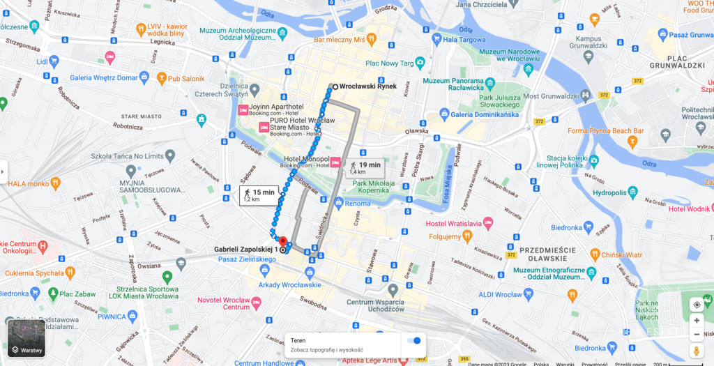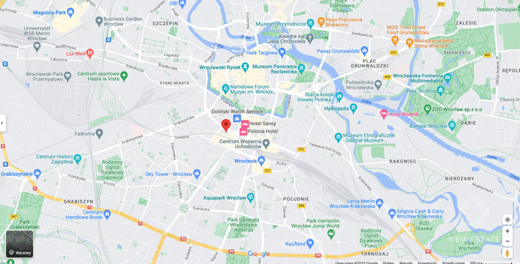 The apartment is located in the very center of Wroclaw. In the vicinity, there are three major transportation hubs - the Arkady stop (tram and bus) right below the building (as well as Renoma), providing connections north-south as well as east-west, and a bit further the Świdnicka stop. A big advantage is the proximity to a park (near the puppet theater and the moat), green areas, as well as numerous shops, cafes, and restaurants.